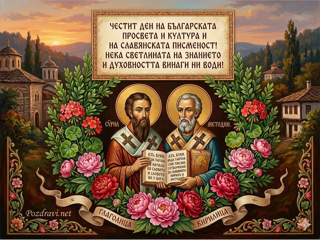 Картичката изобразява Светите братя Кирил и Методий, седнали с отворена книга, заобиколени от богата флорална рамка и исторически сгради на заден план. В горната част на картичката има текст: 'ЧЕСТИТ ДЕН НА БЪЛГАРСКАТА ПРОСВЕТА И КУЛТУРА И НА СЛАВЯНСКАТА ПИСМЕНОСТ! НЕКА СВЕТЛИНАТА НА ЗНАНИЕТО И ДУХОВНОСТТА ВИНАГИ НИ ВОДИ!'.
