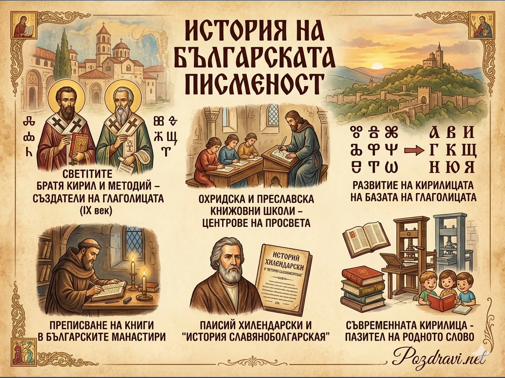 * Централен акцент: Величествено заглавие 'История на българската писменост', обградено от фигурите на светите братя Кирил и Методий и символите на глаголицата.