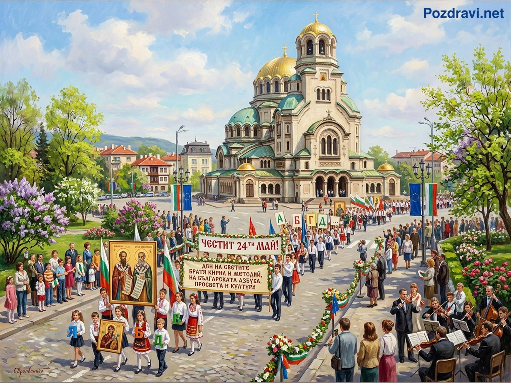 На картината е изобразен празничен парад по случай 24 май пред величествения катедрален храм 'Свети Александър Невски' в София. Ученици и граждани шестват по улицата, носейки икони на Светите братя Кирил и Методий, български знамена и транспаранти с надписи 'ЧЕСТИТ 24 МАЙ!' и 'ДЕН НА СВЕТИТЕ БРАТЯ КИРИЛ И МЕТОДИЙ, НА БЪЛГАРСКАТА АЗБУКА, ПРОСВЕТА И КУЛТУРА'. Малки деца гордо държат букви от кирилицата, а отстрани оркестър свири празнична музика. Сцената е изпълнена с пролетни цветове от цъфтящи храсти и дървета, под ясно синьо небе, създавайки атмосфера на национална гордост и тържество.