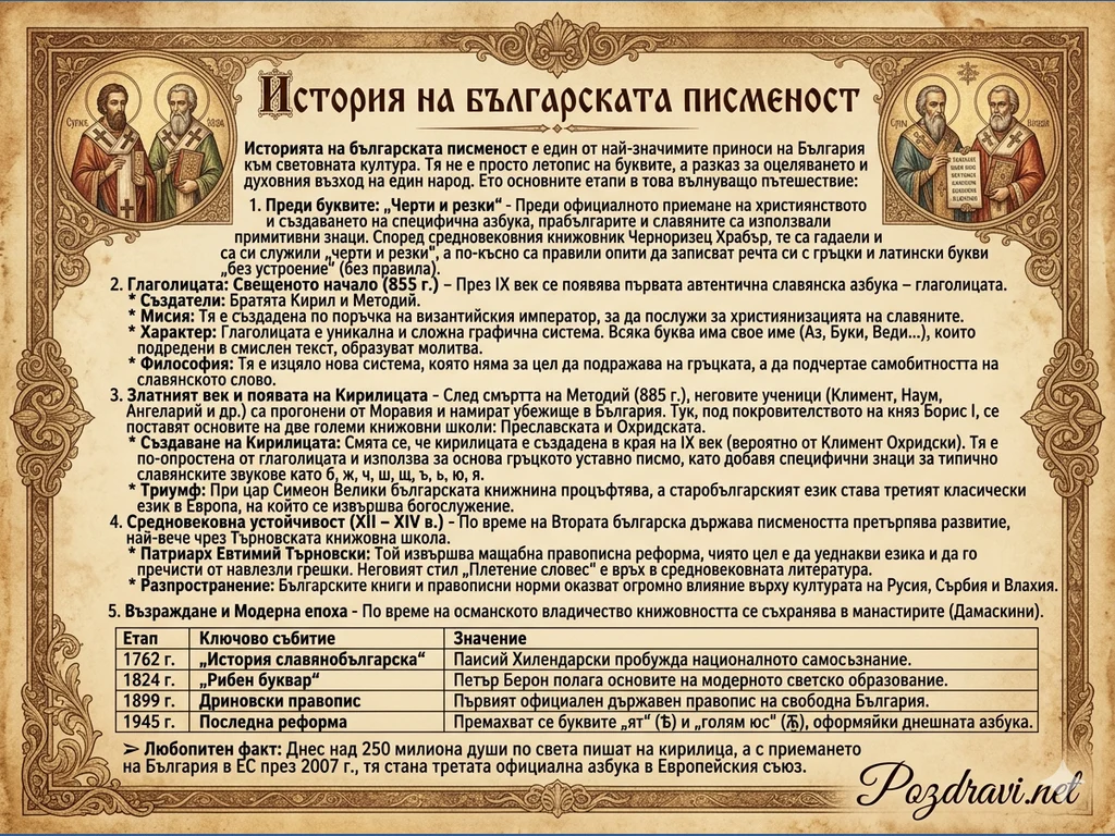 Тази красива ретро картичка е истинско произведение на изкуството, посветено на славната история на българската писменост. Разположен на елегантен, пергаментоподобен фон, текстът ни пренася през ключовите етапи от създаването и развитието на азбуката.