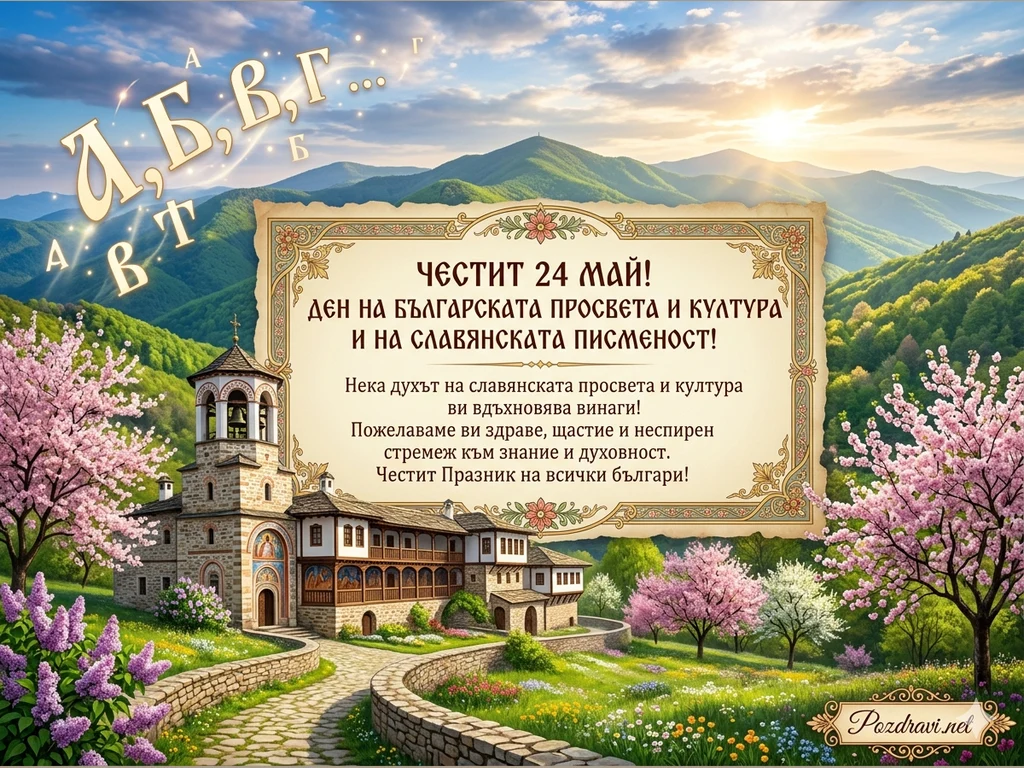 Тази красива поздравителна картичка, посветена на 24 май – Деня на българската просвета и култура и на славянската писменост, представя хармоничен пейзаж, съчетаващ природа и традиция. Централно място заема възрожденска църква с камбанария, разположена сред живописни планини под лъчите на изгряващото слънце. Пролетният цъфтеж на вишневи дървета и люляк придава на сцената усещане за ново начало и жизненост.