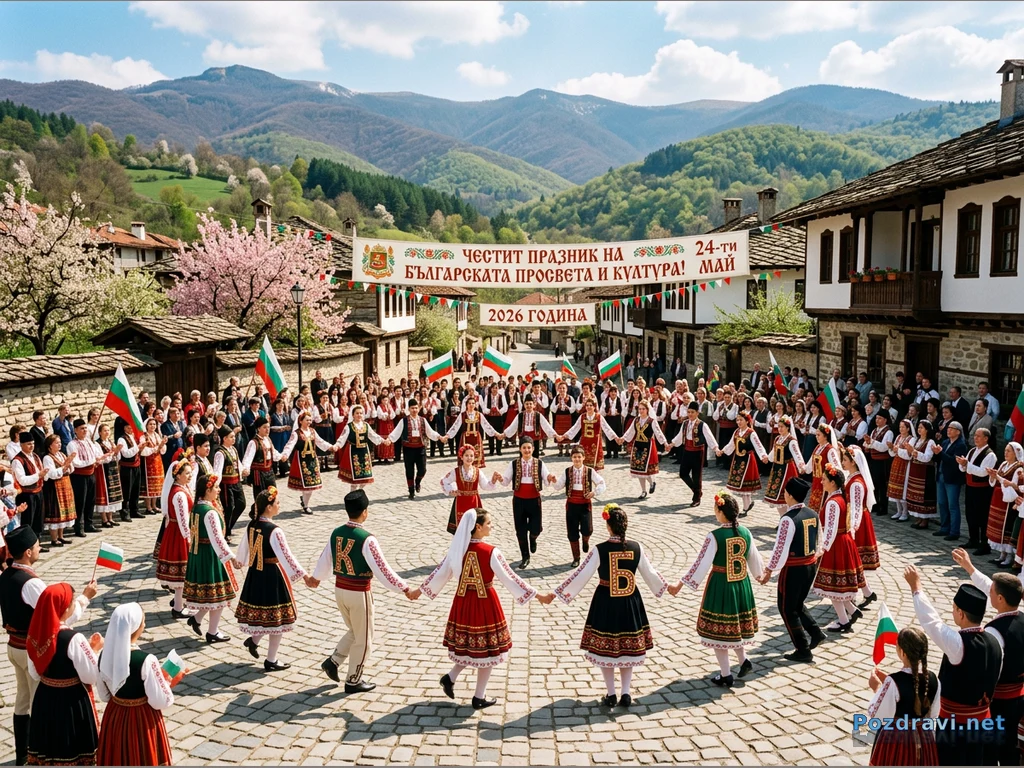 Голямо българско хоро, играно от множество хора в народни носии на павиран площад в традиционно българско село. Участниците държат български знамена, а някои от тях имат големи кирилски букви на гърба на носиите си. Над площада е опънат транспарант с надпис 'Честит празник на българската просвета и култура! 24-ти май 2026 година'. Заден план разкрива живописни стари къщи, цъфнали дръвчета и зелени планини под ясно синьо небе. Атмосферата е празнична и изпълнена с национален дух, отбелязваща важен български празник.