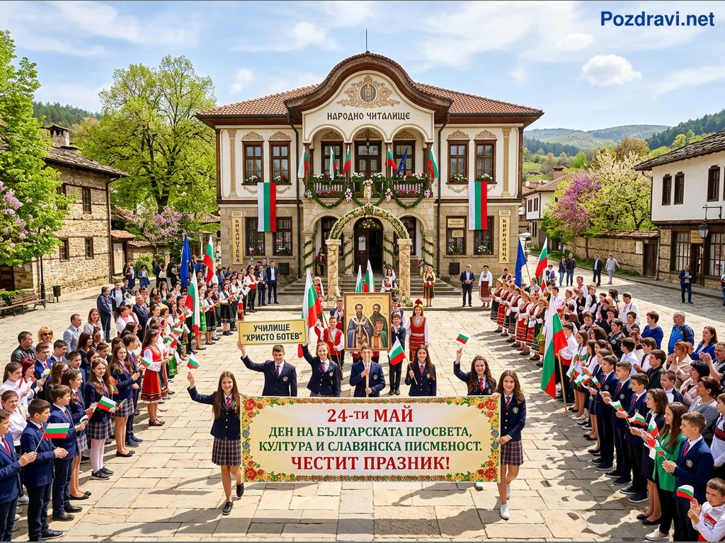 На снимката е запечатан тържествен парад или събиране по случай 24 май, Деня на българската просвета и култура, пред красиво Народно читалище. Множество деца и ученици, облечени в униформи и народни носии, са строени на площада, развявайки български знамена. В центъра на събитието се вижда голям транспарант с надпис '24-ти МАЙ ДЕН НА БЪЛГАРСКАТА ПРОСВЕТА, КУЛТУРА И СЛАВЯНСКА ПИСМЕНОСТ. ЧЕСТИТ ПРАЗНИК!', носен от две усмихнати момичета. Присъстващите държат икона на Светите братя Кирил и Методий, както и табела с името на училище 'Христо Ботев', подчертавайки образователния и културен характер на празника. Атмосферата е празнична и патриотична, с богато украсена сграда и традиционна българска архитектура наоколо.