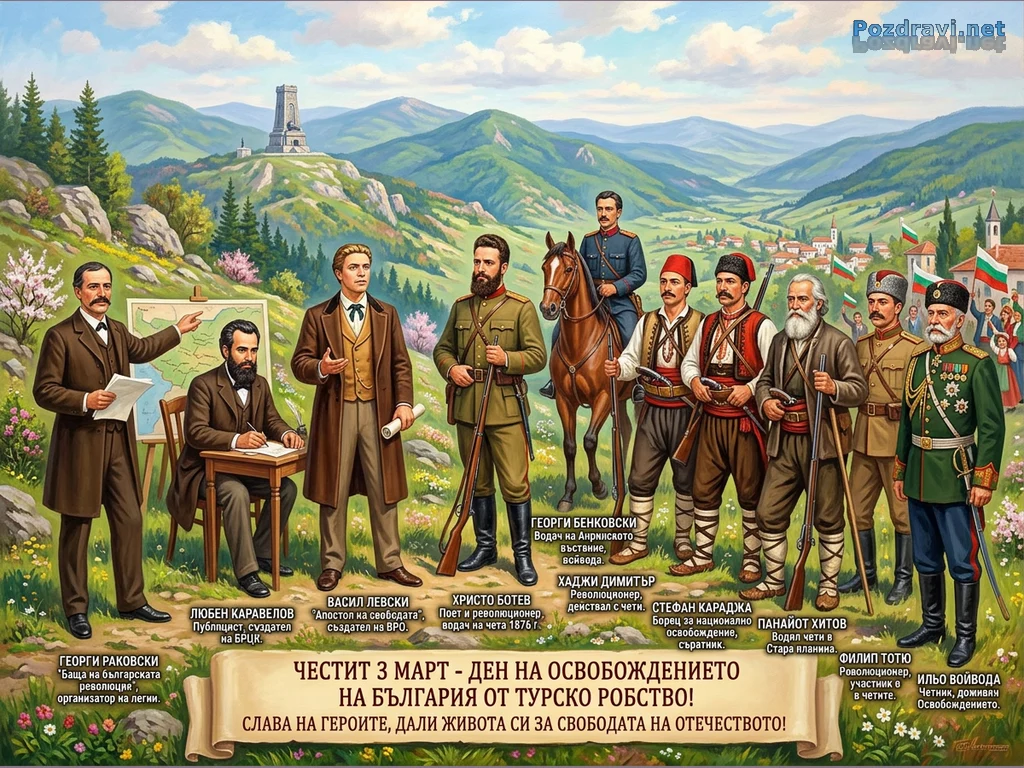 Картината изобразява група от дванадесет видни български революционери и възрожденци, разположени на фона на живописен планински пейзаж с паметника на Шипка. Сред тях са Георги Раковски, Любен Каравелов, Васил Левски, Христо Ботев и други герои, всеки от които е допринесъл за освобождението на България, представени в характерни за епохата облекла и с атрибути. На заден план се виждат зелени хълмове, долина с традиционно българско село, украсено с национални знамена, символизиращи свободата. В долната част е разположен свитък с надпис 'ЧЕСТИТ 3 МАРТ - ДЕН НА ОСВОБОЖДЕНИЕТО НА БЪЛГАРИЯ ОТ ТУРСКО РОБСТВО! СЛАВА НА ГЕРОИТЕ, ДАЛИ ЖИВОТА СИ ЗА СВОБОДАТА НА ОТЕЧЕСТВОТО!', подчертаващ патриотичното послание.