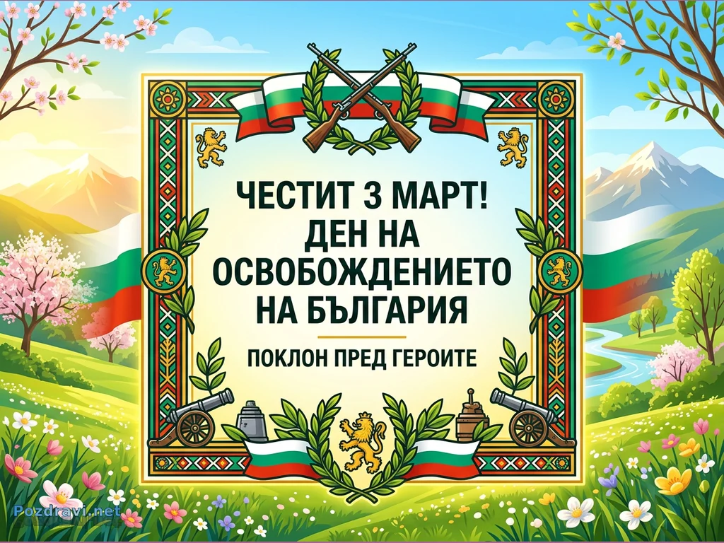 Тази празнична картичка отбелязва 3 март – Деня на Освобождението на България, с централен надпис 'ЧЕСТИТ 3 МАРТ! ДЕН НА ОСВОБОЖДЕНИЕТО НА БЪЛГАРИЯ ПОКЛОН ПРЕД ГЕРОИТЕ'. Текстът е ограден от богато украсена рамка с български знамена, прекръстосани пушки, топове и лъвове, обгърнати от лаврови венци. Фонът е живописен пролетен пейзаж, включващ зелени хълмове, цъфтящи дървета, река и заснежени планини под ясно синьо небе. Цялостната композиция е изпълнена с патриотизъм и уважение към националния празник.