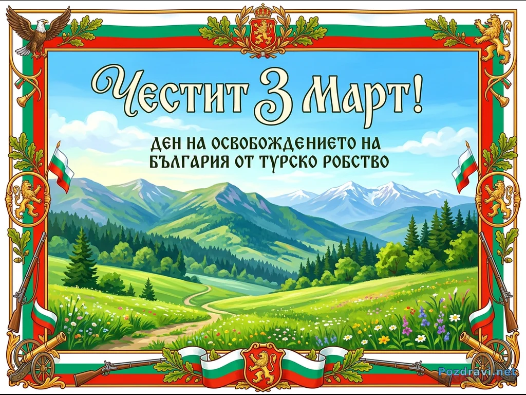 Тази празнична картичка отбелязва 3 март – Деня на Освобождението на България. Тя изобразява живописен планински пейзаж с тучни зелени хълмове, гъсти гори и заснежени върхове под ясно синьо небе, през който се вие полски път. В центъра е изписано 'Честит 3 Март! ДЕН НА ОСВОБОЖДЕНИЕТО НА БЪЛГАРИЯ ОТ ТУРСКО РОБСТВО'. Рамката е богато украсена с елементи на българската национална символика, включващи цветовете на знамето, герба с лъва, орел, пушки, оръдие и рог, подчертавайки патриотичния дух на празника.