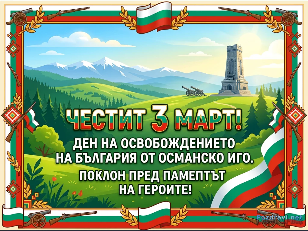 Тази празнична картичка отбелязва 3 март, Деня на Освобождението на България. В центъра на композицията е изобразен Паметникът на свободата на връх Шипка, заобиколен от зелени хълмове, борови гори и величествени планини под ясно небе. Пред паметника са разположени две старинни оръдия, символизиращи битките за свобода. Картичката е рамкирана с български знамена, пушки, оръдия и традиционни шевици, а централният надпис гласи: 'ЧЕСТИТ 3 МАРТ! ДЕН НА ОСВОБОЖДЕНИЕТО НА БЪЛГАРИЯ ОТ ОСМАНСКО ИГО. ПОКЛОН ПРЕД ПАМЕТТЪТ НА ГЕРОИТЕ!'. Цялостният дизайн е в ярък, илюстративен стил, предаващ тържественост и национална гордост.