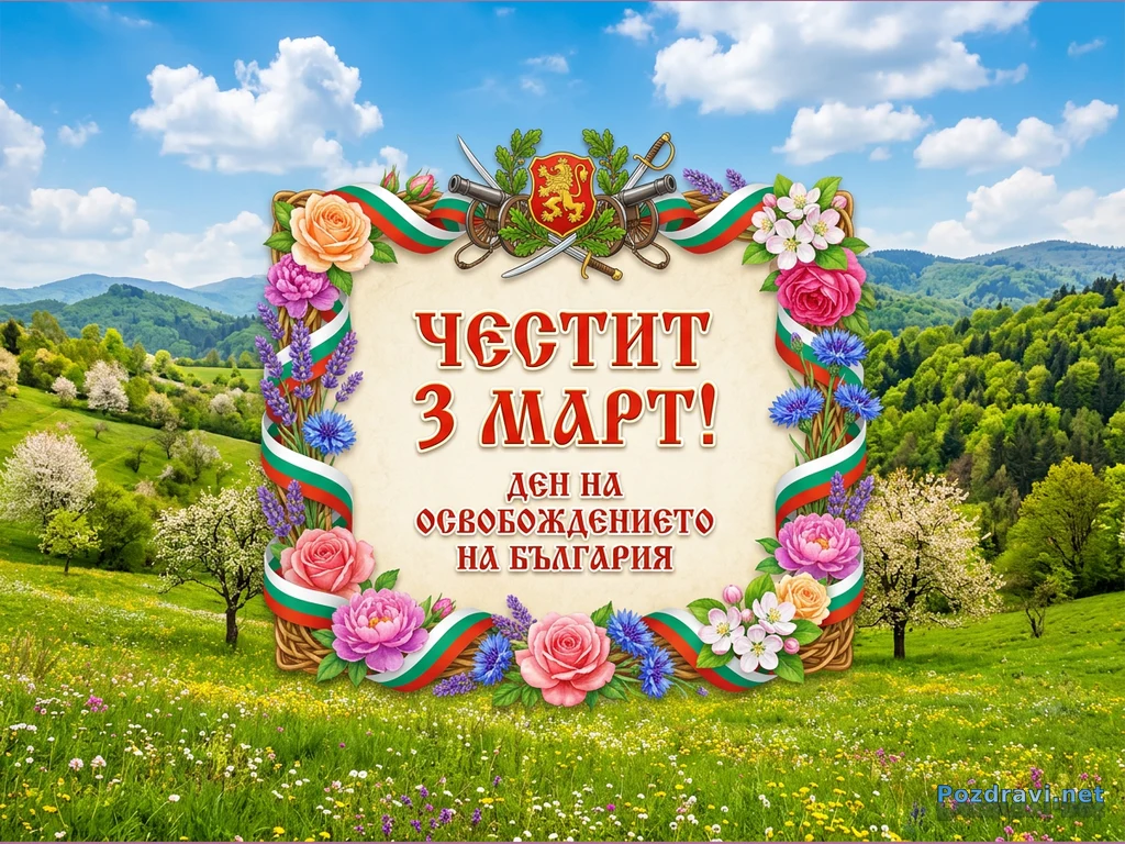 Празнична картичка за 3 март, Деня на Освобождението на България, е разположена на фона на живописен пролетен пейзаж. Централно място заема рамка с надпис 'ЧЕСТИТ 3 МАРТ! ДЕН НА ОСВОБОЖДЕНИЕТО НА БЪЛГАРИЯ', украсена с ленти в цветовете на българския флаг. Рамката е обсипана с разнообразни цветя като рози, божури, метличини и лавандула, а в горната част е изобразен герб с лъв, саби и оръдия. Зад нея се простират зелени хълмове, цъфтящи дървета и поляна, осеяна с диви цветя под ясно синьо небе с пухкави облаци.