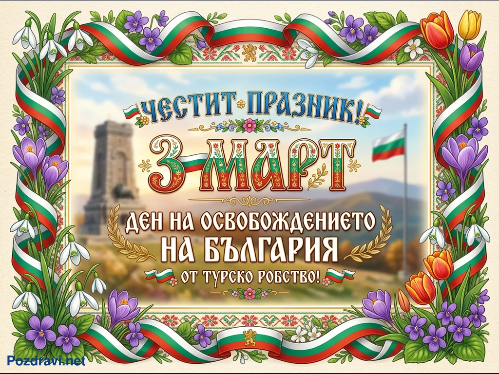 Тази празнична картичка отбелязва 3-ти март, Националния празник на България. Тя е оформена с богато украсена рамка от панделки в цветовете на българския трибагреник, преплетени с пролетни цветя като кокичета, минзухари, теменужки и лалета, както и традиционни шевици. В центъра е изписан поздравът 'ЧЕСТИТ ПРАЗНИК! 3 МАРТ ДЕН НА ОСВОБОЖДЕНИЕТО НА БЪЛГАРИЯ ОТ ТУРСКО РОБСТВО!', като цифрата '3' и буквите 'МАРТ' са стилизирани с елементи от трибагреника. На заден план, леко разфокусирани, се виждат Паметникът на свободата на Шипка и развяващо се българско знаме, подчертаващи историческото значение на деня. Цялостната композиция е ярка, патриотична и изпълнена с празнично настроение.