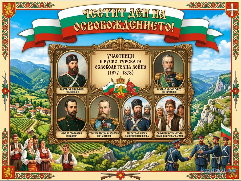 Тази празнична картичка отбелязва Деня на Освобождението на България, изобразявайки ключови моменти и личности от Руско-турската освободителна война (1877-1878). В центъра са разположени портрети на български опълченци, руски генерали като Гурко и Скобелев, както и сцени с героите от Шипка и обикновени българи, подпомагащи руската армия. Над тях се вее българският трибагреник с надпис 'ЧЕСТИТ ДЕН НА ОСВОБОЖДЕНИЕТО!', а фонът разкрива живописни български пейзажи с планински върхове и традиционни селища. В долната част са показани българи в народни носии, празнуващи, и руски войници, които се ръкуват с местното население, символизирайки освобождението и благодарността. Цялостният дизайн е богато орнаментиран с фолклорни мотиви, герба на България и преплетени пушки, подчертавайки историческото и национално значение на събитието.