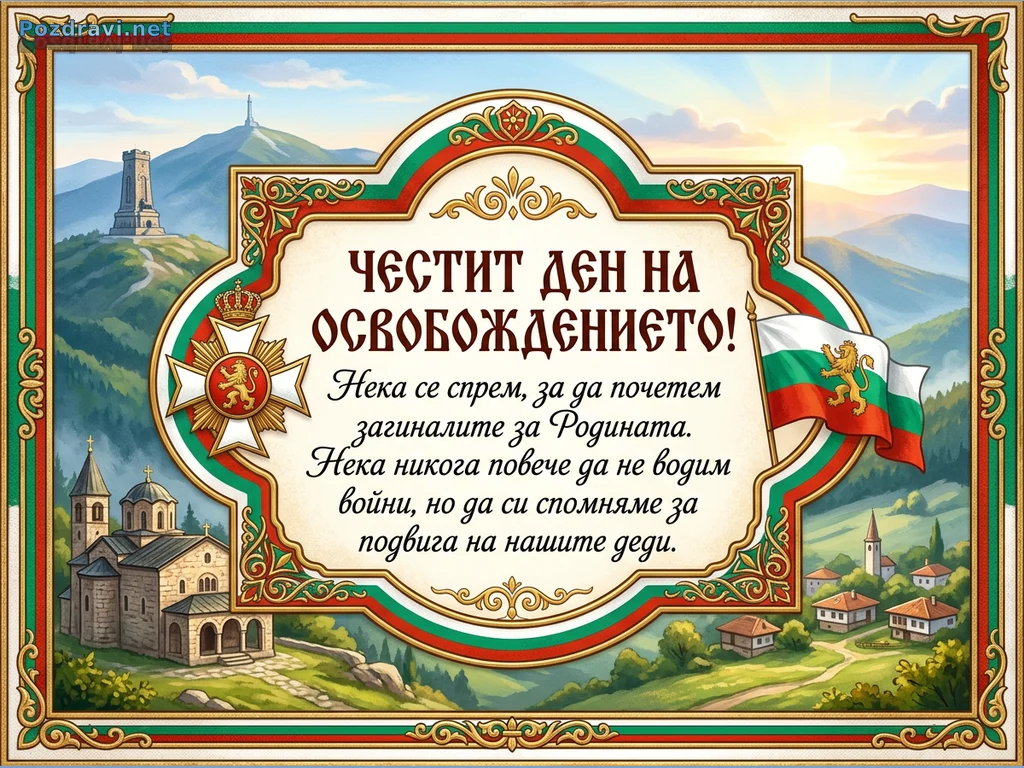 Празнична илюстрация, посветена на Деня на Освобождението на България, с централен орнаментиран надпис 'ЧЕСТИТ ДЕН НА ОСВОБОЖДЕНИЕТО!'. Текстът призовава да почетем загиналите за Родината и да помним подвига на дедите си, без да водим войни. Композицията включва Орден 'За храброст' и развяващ се български трибагреник, рамкирани от традиционни български пейзажи. На заден план се виждат Паметникът на Шипка, манастир и живописно българско село, всичко това под ясно небе с изгряващо слънце.