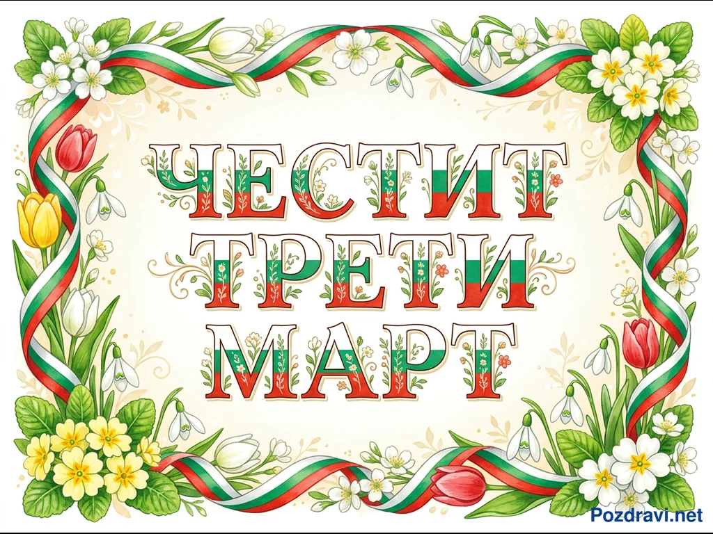 Поздравителна картичка за Трети март с надпис 'ЧЕСТИТ ТРЕТИ МАРТ' в центъра. Буквите са богато орнаментирани с флорални мотиви и елементи от българския трибагреник. Рамката на картичката е оформена от лента в цветовете на националния флаг, преплетена с разнообразни пролетни цветя. Сред тях се открояват кокичета, лалета в червено, жълто и бяло, както и жълти иглики. Общият дизайн е празничен и патриотичен, с нежен фон с флорални шарки.