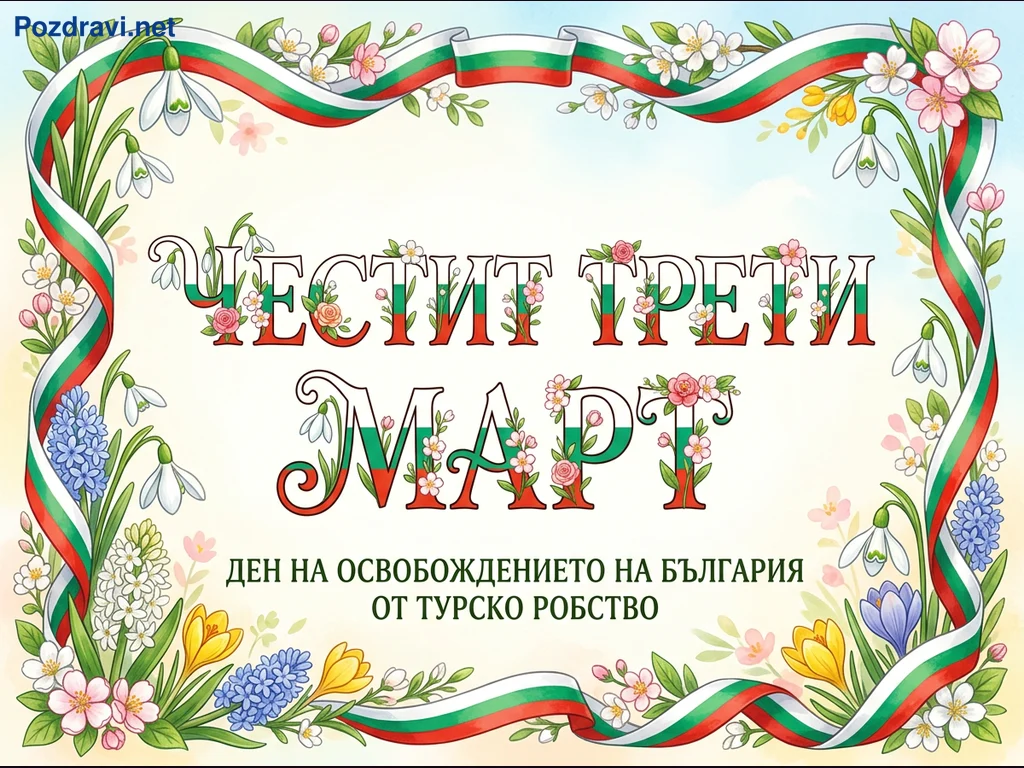 Тази празнична картичка отбелязва Трети март, Националния празник на България. Рамката е оформена от лента в цветовете на българското знаме, преплетена с нежни пролетни цветя като кокичета, зюмбюли, минзухари и цъфнали клонки. В центъра е изписан надписът 'ЧЕСТИТ ТРЕТИ МАРТ', чиито букви са оцветени в бяло, зелено и червено и украсени с малки розови цветчета. Под него е добавен текстът 'ДЕН НА ОСВОБОЖДЕНИЕТО НА БЪЛГАРИЯ ОТ ТУРСКО РОБСТВО', подчертаващ значението на датата. Общият дизайн е светъл и празничен, с акварелен ефект на фона.