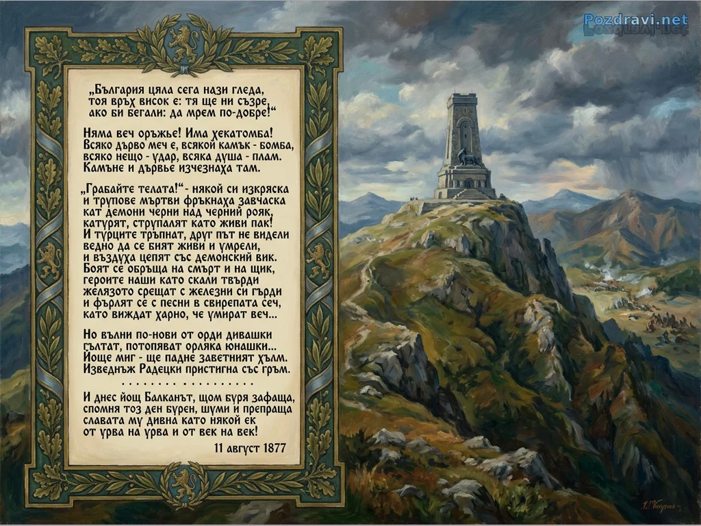 Картината представя величествения Паметник на свободата на връх Шипка, издигащ се на скалист хълм под драматично, буреносно небе. В далечината, в долината под върха, се вижда ожесточена битка с дим и множество фигури, символизираща героичната защита на Шипка. Отляво е разположен богато орнаментиран текст, съдържащ откъс от поемата 'Опълченците на Шипка' на Иван Вазов, описващ събитията от 11 август 1877 г. Цялостната композиция предава силно чувство за историческа памет, героизъм и драматизъм.