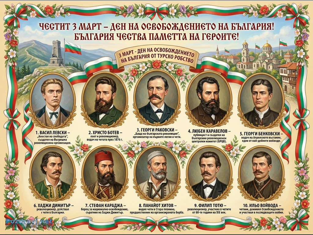 Ключови фрази: 3 март България, Български герои, Национално освобождение, Възрожденски дейци, Патриотичен плакат
