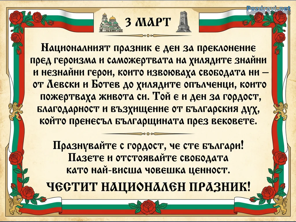 Празнична картичка за 3 март, Националния празник на България, е оформена с елегантна рамка, включваща българския трибагреник, червени рози и златни лъвове. В горната част са изобразени Паметникът на Шипка и катедралата 'Св. Александър Невски', заедно с надписа '3 МАРТ' и български знамена. Централното послание възхвалява героизма и саможертвата на българските герои, извоювали свободата. То призовава към гордост от българския дух и опазване на свободата като най-висша човешка ценност. Картичката завършва с поздрав 'ЧЕСТИТ НАЦИОНАЛЕН ПРАЗНИК!'.