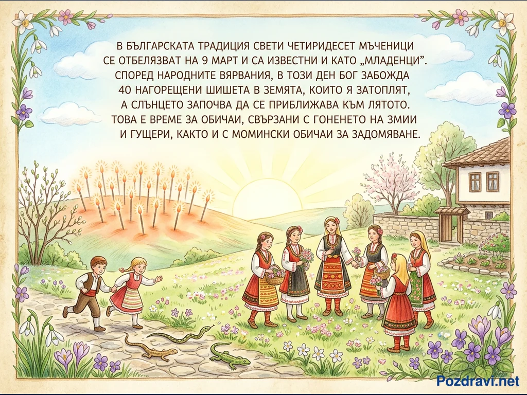 Тази илюстрация пресъздава българския народен празник Младенци, отбелязван на 9 март, с богати детайли и ярки цветове. В преден план момче и момиче в народни носии гонят змии и гущери по калдъръмена пътека, символизирайки прогонването на злото. Зад тях, сред цъфтяща поляна, група девойки в пъстри традиционни облекла събират цветя, а на хълм в далечината горят четиридесет свещи, олицетворяващи затоплянето на земята. Сцената е допълнена от традиционна българска къща, разцъфнало дърво и изгряващо слънце, всичко обградено от рамка с пролетни цветя.