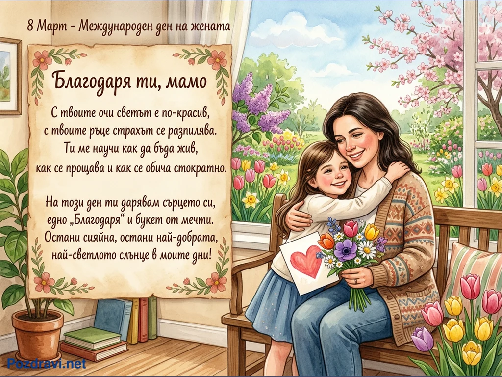 Тази илюстрация е празнична картичка за 8 март, изобразяваща топла сцена на майка и дъщеря. Двете са в нежна прегръдка, като момиченцето държи букет от пролетни цветя и картичка със сърце. Седят до прозорец, разкриващ живописна пролетна градина с цъфтящи дървета, лалета, нарциси и люляци. Отляво е разположен свитък с трогателно стихотворение, озаглавено 'Благодаря ти, мамо', което допълва посланието за обич и признателност. Цялостната композиция излъчва радост, нежност и пролетно настроение.