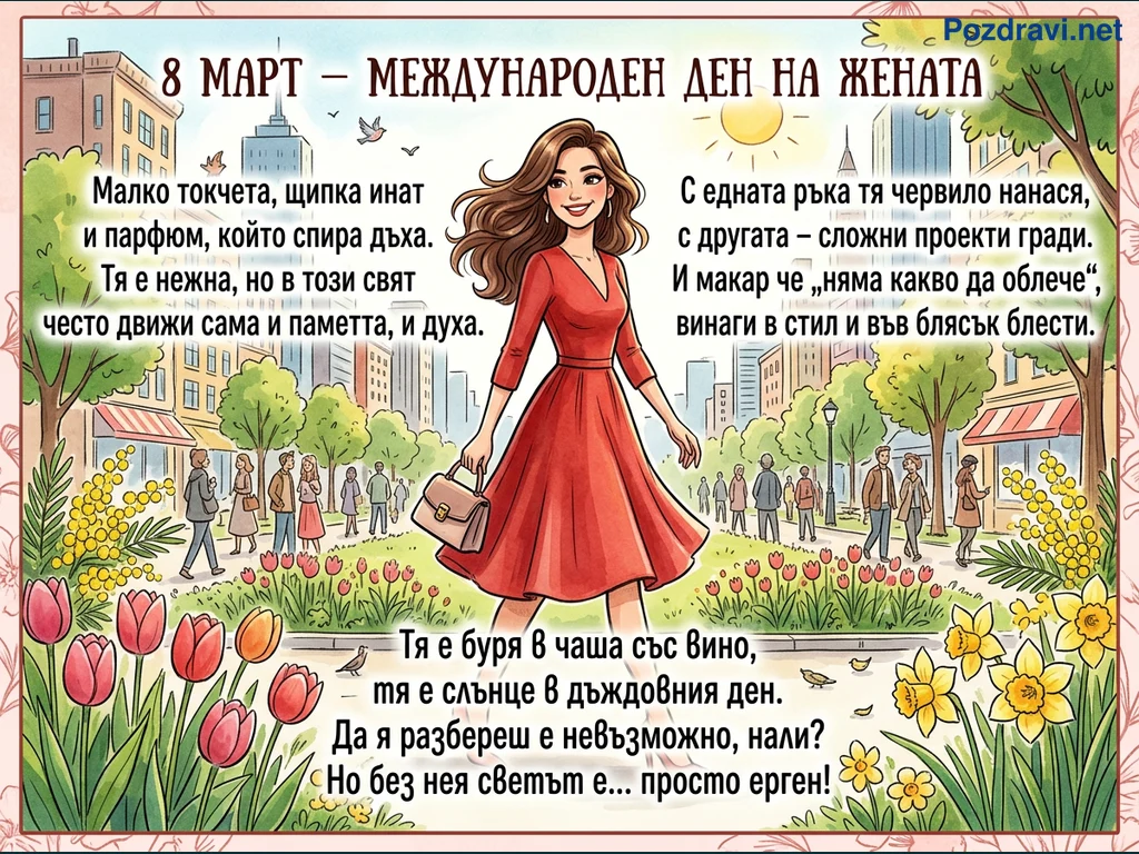 Тази цветна илюстрация е празнична картичка за 8 март – Международен ден на жената. В центъра е изобразена усмихната жена с дълга кестенява коса, облечена в елегантна червена рокля, която уверено върви напред, носейки чанта. Около нея е оживен градски пейзаж с високи сгради, дървета и хора, разхождащи се в парка. Предният план е украсен с ярки пролетни цветя като лалета, нарциси и мимоза, а текстът възхвалява многостранната същност на жената – нежна, силна, стилна и незаменима. Картичката излъчва позитивно настроение и празнува женската сила и красота.