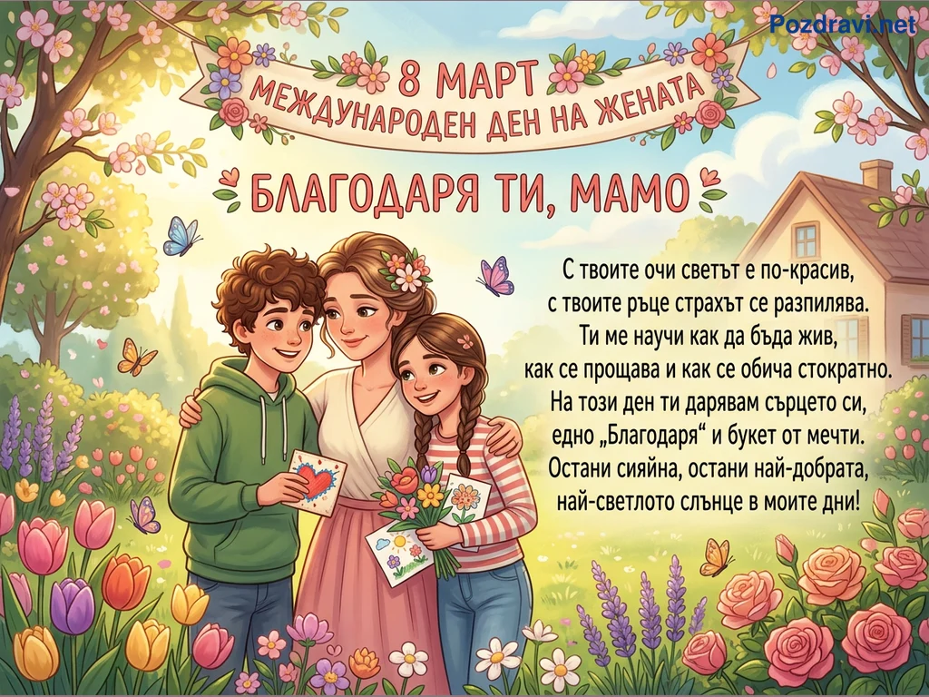 Тази илюстрация изобразява сърдечна сцена за 8 март, показваща майка, прегърнала своите две деца – момче и момиче – в разцъфтяла пролетна градина. Децата ѝ подаряват ръчно изработени подаръци: момчето държи картичка със сърце, а момичето – букет цветя и рисунка. Над тях се вижда празничен надпис '8 МАРТ МЕЖДУНАРОДЕН ДЕН НА ЖЕНАТА' и 'БЛАГОДАРЯ ТИ, МАМО', допълнен от нежно стихотворение. Около тях летят пеперуди сред изобилие от лалета, лавандула и рози, създавайки топла и радостна атмосфера.