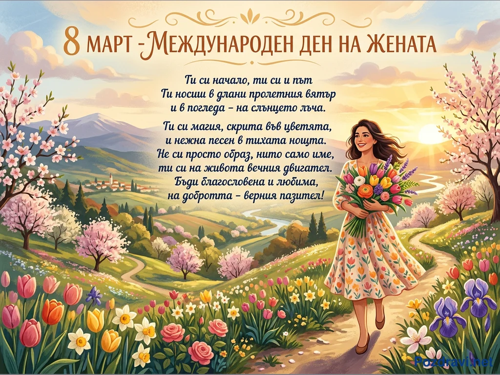Тази ярка илюстрация отбелязва 8 март – Международен ден на жената, изобразявайки живописна пролетна сцена. В центъра е усмихната жена с цветна рокля, която върви по пътека, носейки голям букет от лалета, нарциси и други пролетни цветя. Около нея се разстила тучен пейзаж с цъфтящи дървета, зелени хълмове, виеща се река и малко селце на хоризонта, огряно от залязващото слънце. Предният план е изпълнен с изобилие от пъстри цветя, а в горната част е изписано празничното послание и стихотворение.