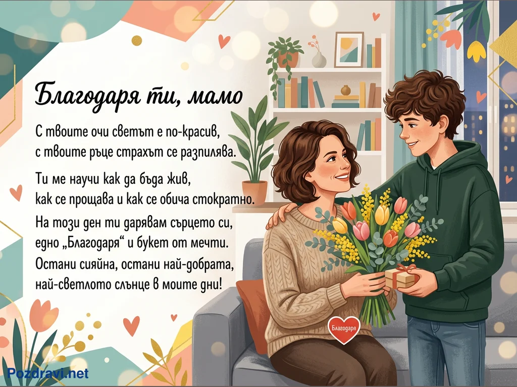 Млад мъж подарява букет цветя и малък подарък на усмихната жена, която седи до него на диван. Жената, вероятно майка му, го гледа с нежност, докато той е прегърнал рамото ѝ. На заден план се виждат библиотека с книги и прозорец с градски пейзаж през нощта, създавайки уютна домашна обстановка. В лявата част на картината е изписано послание 'Благодаря ти, мамо', изразяващо дълбока признателност и обич.