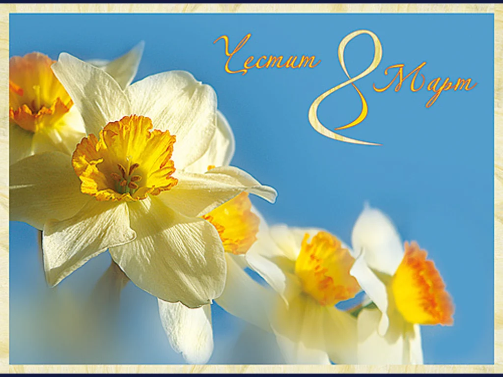Ключови фрази: Картичка пожелание поздрави нарциси цветя рисувана празник осми март