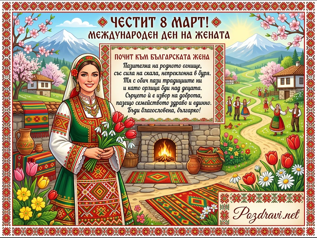 Тази празнична картичка за 8 март изобразява усмихната българка в красива народна носия, държаща букет от лалета и кокичета. Тя е позиционирана пред уютен домашен интериор с горяща камина и пъстри тъкани килими. На заден план се разкрива живописен пролетен пейзаж със заснежени планини, цъфнали дръвчета и хора в традиционни облекла, танцуващи по извит път. В центъра на картичката е поставен текст, отдаващ почит към българската жена, а цялата композиция е обградена от автентични български шевици.