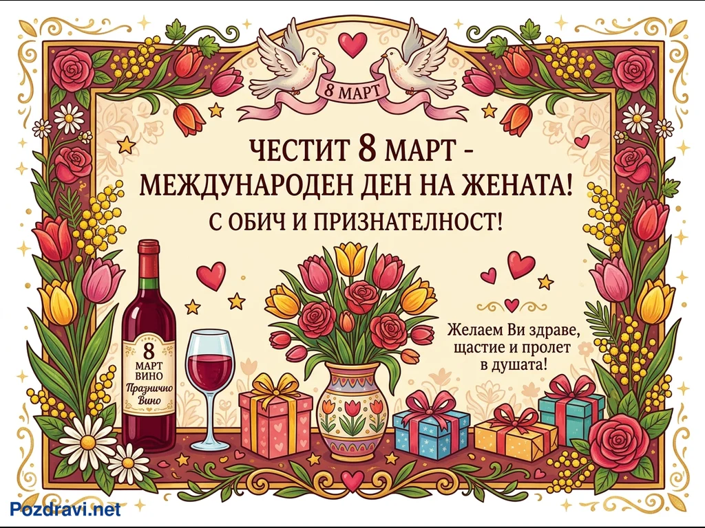 Тази празнична картичка е посветена на Международния ден на жената, 8 март, и е изпълнена с ярки цветове и детайли. Централното послание 'ЧЕСТИТ 8 МАРТ - МЕЖДУНАРОДЕН ДЕН НА ЖЕНАТА! С ОБИЧ И ПРИЗНАТЕЛНОСТ!' е оградено от богато украсена рамка с пролетни цветя като лалета, рози, маргаритки и мимоза. В горната част две бели гълъбчета държат панделка с надпис '8 МАРТ', а в долната са изобразени бутилка и чаша червено вино, букет цветя във ваза и няколко опаковани подаръчни кутии. Допълнително пожелание за здраве, щастие и пролет в душата допълва празничната атмосфера.