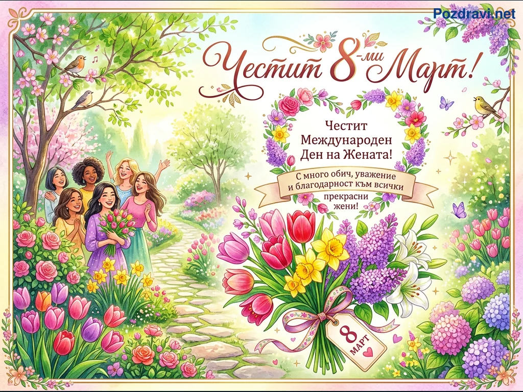 Тази ярка илюстрация е празнична картичка за 8-ми март, изобразяваща група усмихнати жени с различен етнически произход, които се разхождат по калдъръмена пътека в разцъфнала пролетна градина. Около тях цъфтят лалета, рози, нарциси и люляци, а птици пеят по дърветата, докато пеперуди летят наоколо. Вдясно е показан голям букет от пролетни цветя, включващ лалета, нарциси, люляци и лилии, завързан с панделка и етикет '8 МАРТ'. Надписът 'Честит 8-ми Март!' е изписан с елегантен шрифт, допълнен от пожелание за 'Честит Международен Ден на Жената!' и благодарност към всички прекрасни жени.