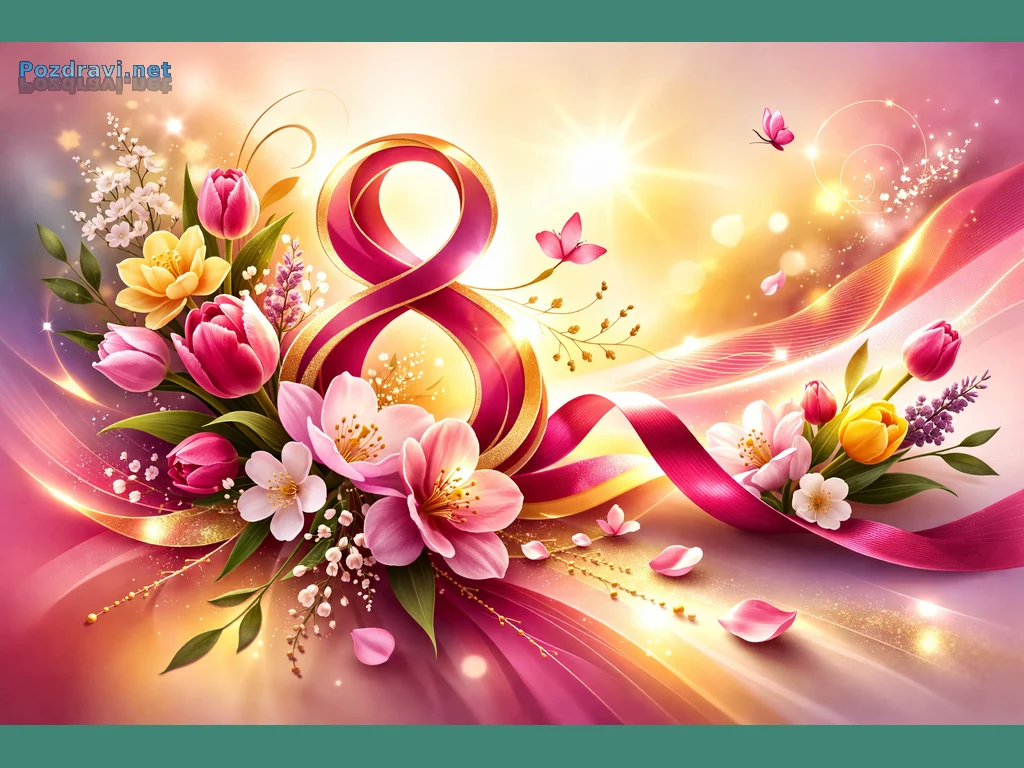 Картичката е абстрактна композиция по случай Осми март. В центъра е стилизирана цифра '8', оформена като розова лента с плавен златист контур и мек блясък.