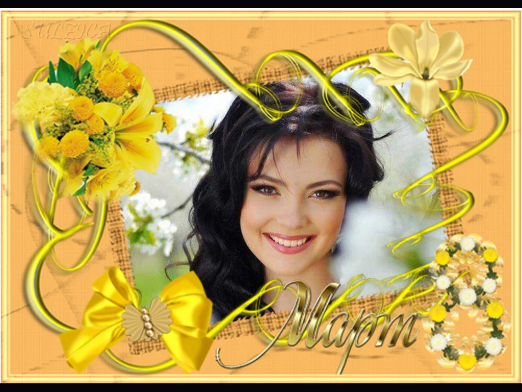 Ключови фрази: Честит празник нежна красива усмихната жена жълти слънчева цветя букет панделка осми март