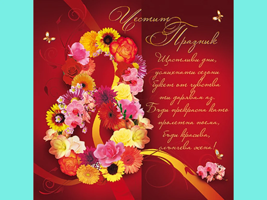 Честит Празник! Щастливи дни, усмихнати сезони , букет от чувства ти дарявам аз. Бъди прекрасна като пролетна поема, бъди красива, слънчева жена