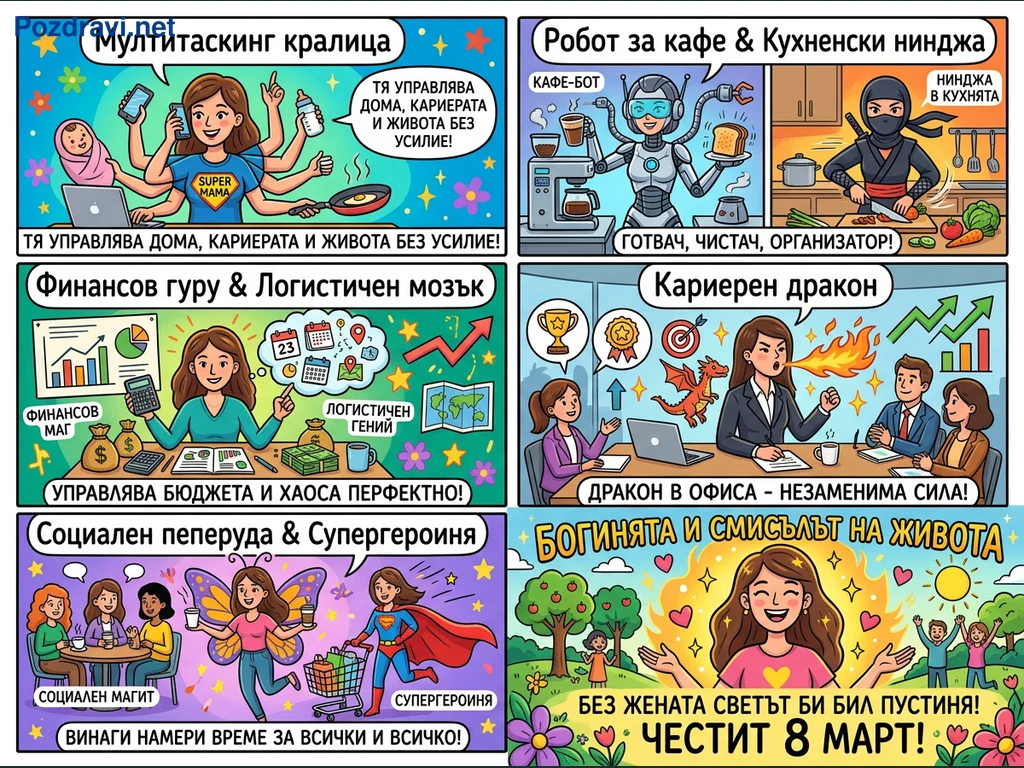 Този комикс от шест панела възхвалява многостранните роли и способности на жените. Всеки панел показва жена като мултитаскинг кралица, домашен робот, финансов експерт, кариерен дракон, социална пеперуда и супергероиня. Тя е представена като незаменима сила, която управлява дома, кариерата и живота с лекота, винаги намирайки време за всичко. Финалният панел я обявява за богиня и смисъл на живота, завършвайки с послание за Честит 8 март. Цялостното послание е за силата, адаптивността и жизненоважната роля на жените в обществото.