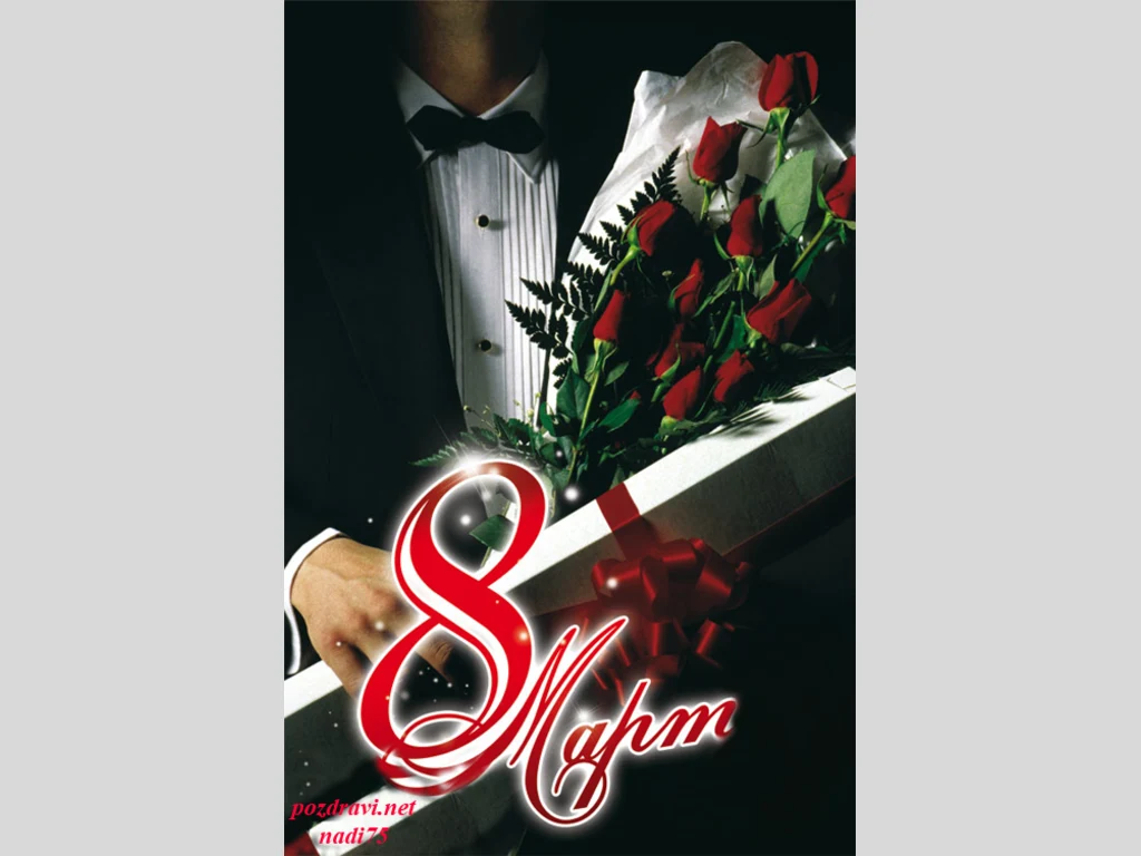 Честити 8 ми март. Картичка подходяща и за най-изисканата дама. Стилно облечен мъж с букет от рози и подарък