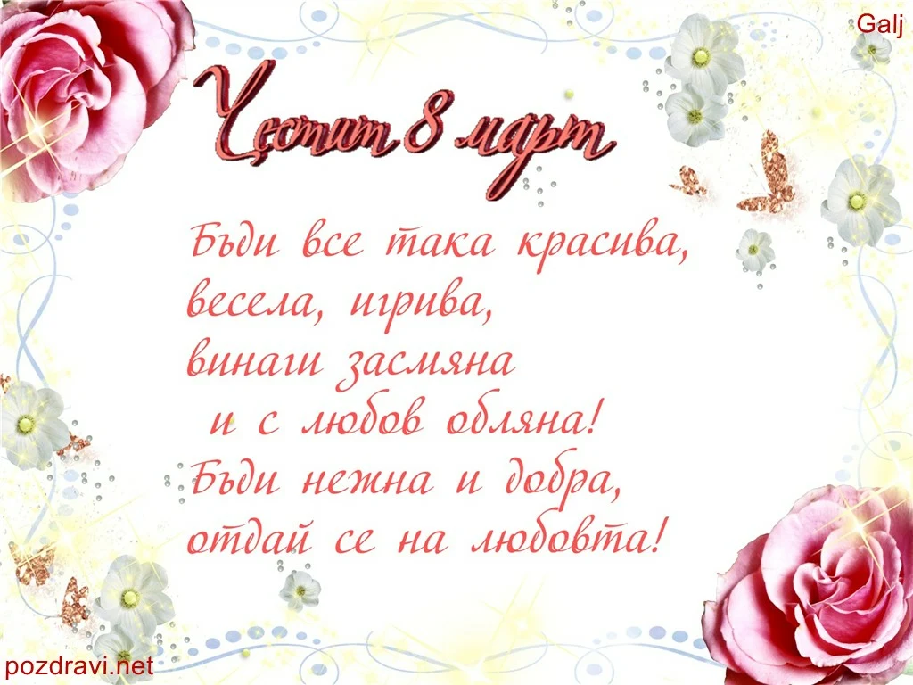 Ключови фрази: Картичка пожелание поздрави празник осми март красива щастлива благословена усмихната радостна букет разцъфнали розови рози пеперуди панделка воал диаманти скъпоценни камъни бижута злато красота любов