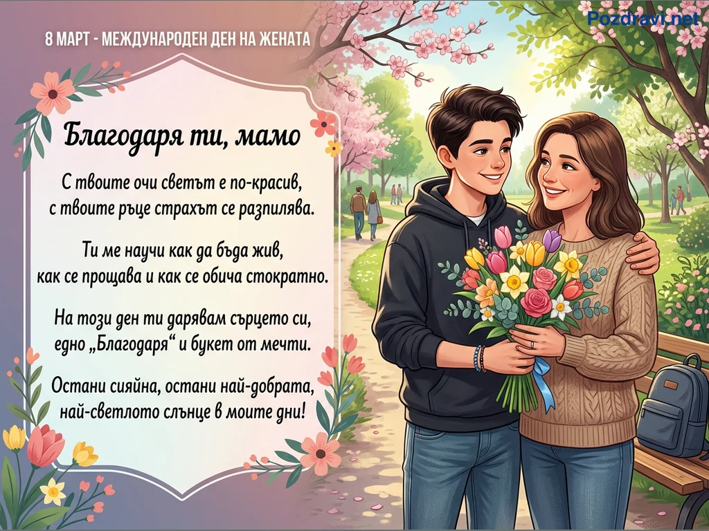 Тази картичка за 8 март изобразява сърдечна сцена в оживен пролетен парк. Млад мъж, прегърнал усмихната жена, вероятно майка си, ѝ подарява пъстър букет от лалета, нарциси и рози. Двамата се гледат с нежност, а на заден план се виждат цъфтящи дървета и други хора, наслаждаващи се на слънчевия ден. Вляво е разположена декоративна рамка с трогателно послание на български език, озаглавено 'Благодаря ти, мамо', изразяващо дълбока признателност. Картичката съчетава мила илюстрация с поетичен текст, посветен на майките по случай Международния ден на жената.
