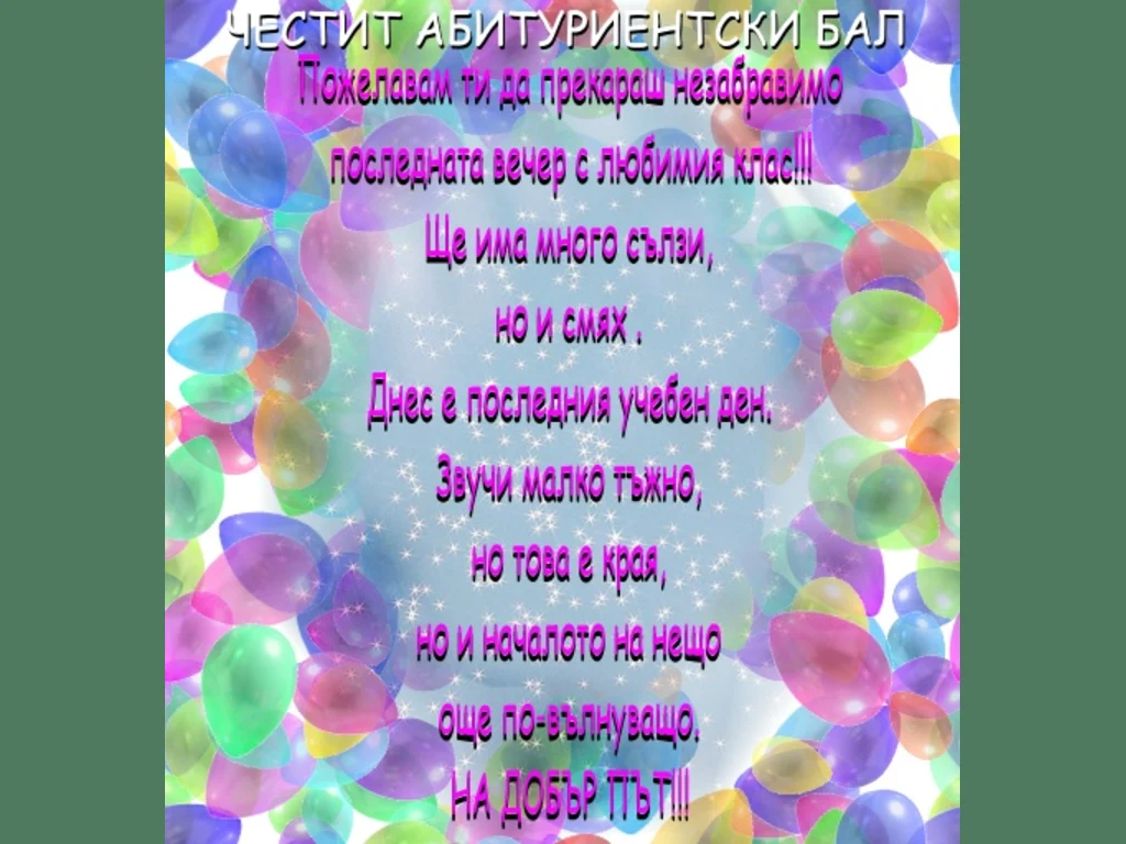 За вашите познати бъдещи студенти, абитуриенти и всички свързани с тях хора. Честит абитуриентски бал!!! Пожелавам ти да прекараш незабравимо последната вечер с любимия клас. Ще има много сълзи, но и смях. Днес е последния учебен ден, звъчи малко тъжно, но това е края, но и началото, на нещо още по вълнуващо. На добър път!!!
