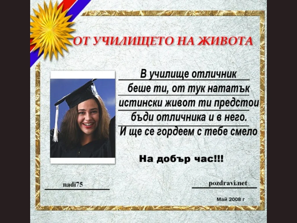 За вашите познати бъдещи студенти, абитуриенти и всички свързани с тях хора. От училището на живота. В училище отличник беше ти, от тук нататък истински живот ти предстои бъди отличник и в него. И ще се гордеем с тебе смело. На добър час!!!