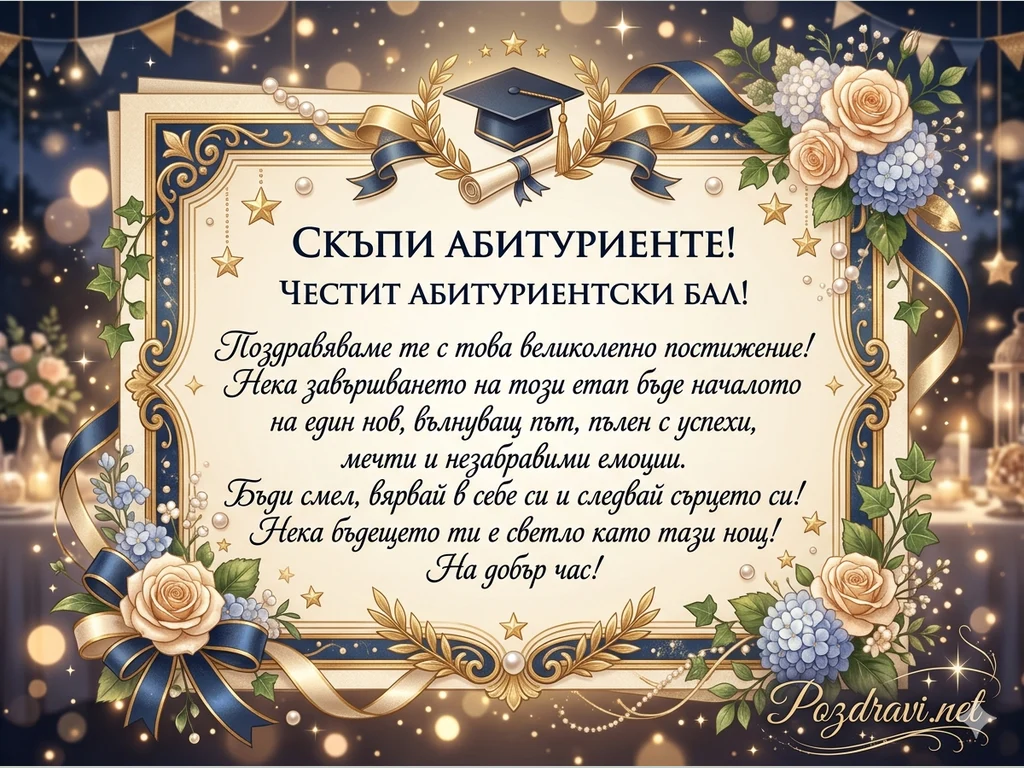 Тази празнична абитуриентска картичка е оформена с красива златна рамка, украсена с рози, хортензии и сини панделки на фона на нежни светлини и звезди. В центъра, на свитък, е изписано вълнуващото пожелание за успешен старт и сбъдване на мечтите. Отгоре са изобразени абсолвентска шапка и диплома – символите на успешното завършване.