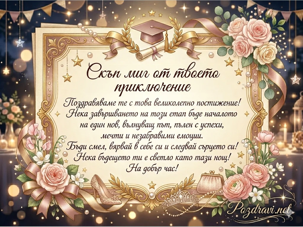 Тази празнична абитуриентска картичка е оформена с красива златна рамка, украсена с рози, хортензии и сини панделки на фона на нежни светлини и звезди. В центъра, на свитък, е изписано вълнуващото пожелание за успешен старт и сбъдване на мечтите. Отгоре са изобразени абсолвентска шапка и диплома – символите на успешното завършване.