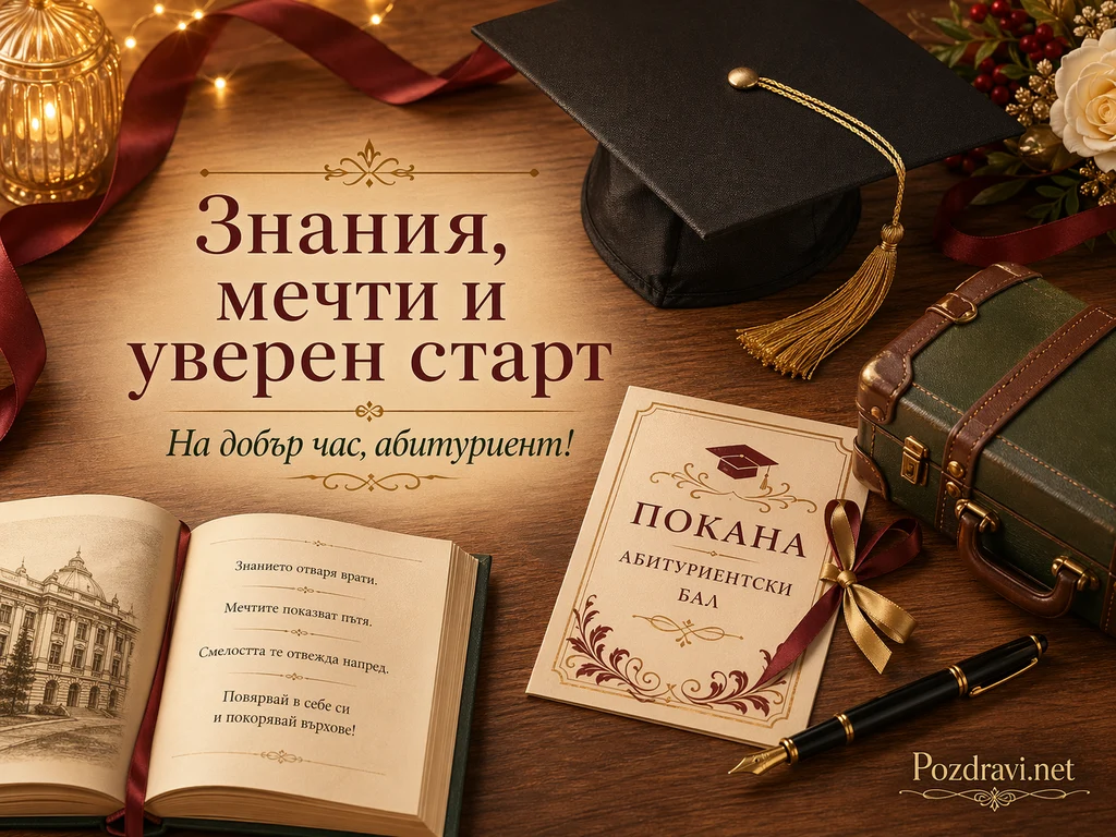 На дървена маса е подредена празнична композиция за абитуриентски бал с академична шапка, книга, покана, куфарче и писалка. Централният надпис гласи дословно: 'Знания, мечти и уверен старт' и 'На добър час, абитуриент!'. Вляво има отворена книга с кратки послания за знание, мечти, смелост и покоряване на върхове. Вдясно е поставена елегантна покана с текст 'ПОКАНА АБИТУРИЕНТСКИ БАЛ', украсена с орнаменти и панделка. Черната академична шапка със златен пискюл подсилва усещането за завършване, постижение и ново начало. Топлите светлини, бордо панделките и цветята създават тържествена и изискана атмосфера. Композицията внушава гордост, надежда и увереност преди важния преход към следващ етап от живота.
