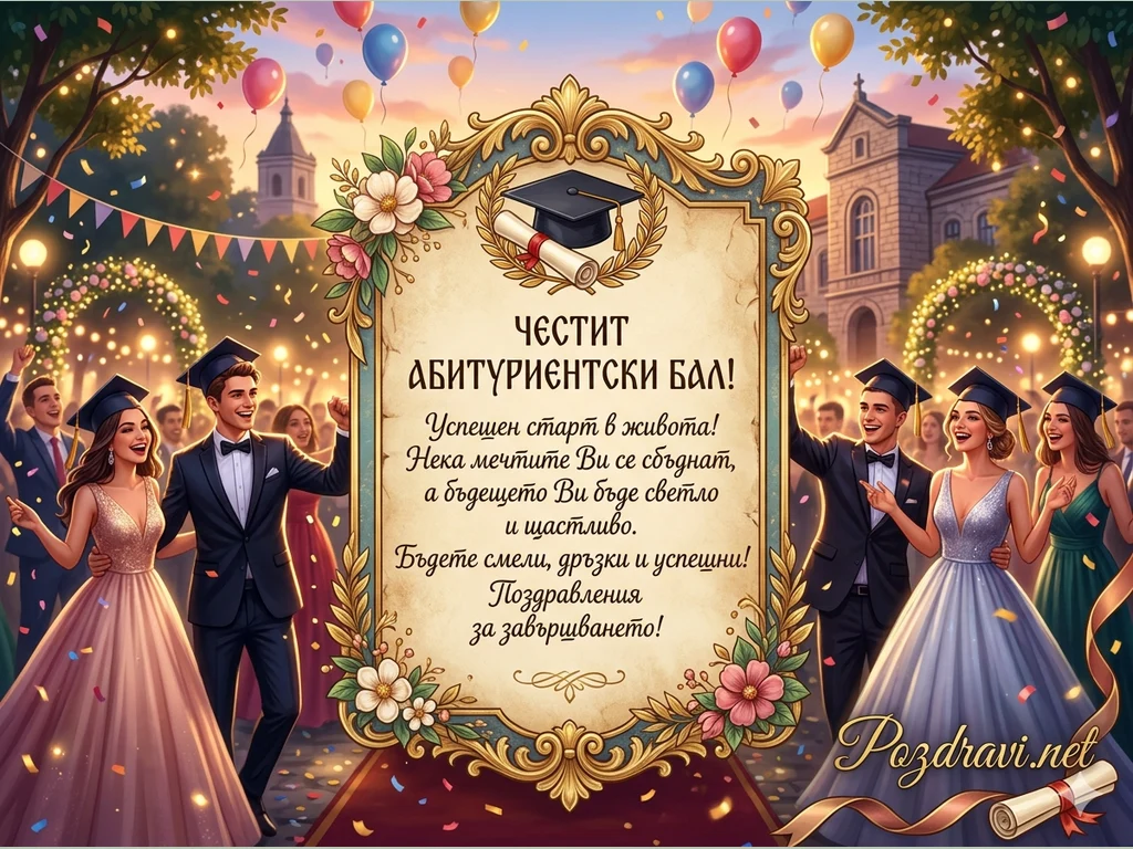 Празнична и изискана картичка за абитуриентски бал с пейзажно разположение. Изображението пресъздава вълнуващата атмосфера на празничната вечер – с балони, конфети и фойерверки в топъл, златист залез. В центъра на картичката, в красива, орнаментирана златна рамка, е вписано искрено и красиво пожелание. Текстът гласи: 'ЧЕСТИТ АБИТУРИЕНТСКИ БАЛ! Успешен старт в живота! Нека мечтите Ви се сбъднат, а бъдещето Ви бъде светло и щастливо. Бъдете смели, дръзки и успешни! Поздравления за завършването!'.