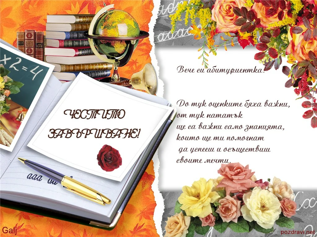 Ключови фрази: картичка пожелание абитуриентка завършване тетрадка химикалка учебници книги звънец глобус букет цветя рози