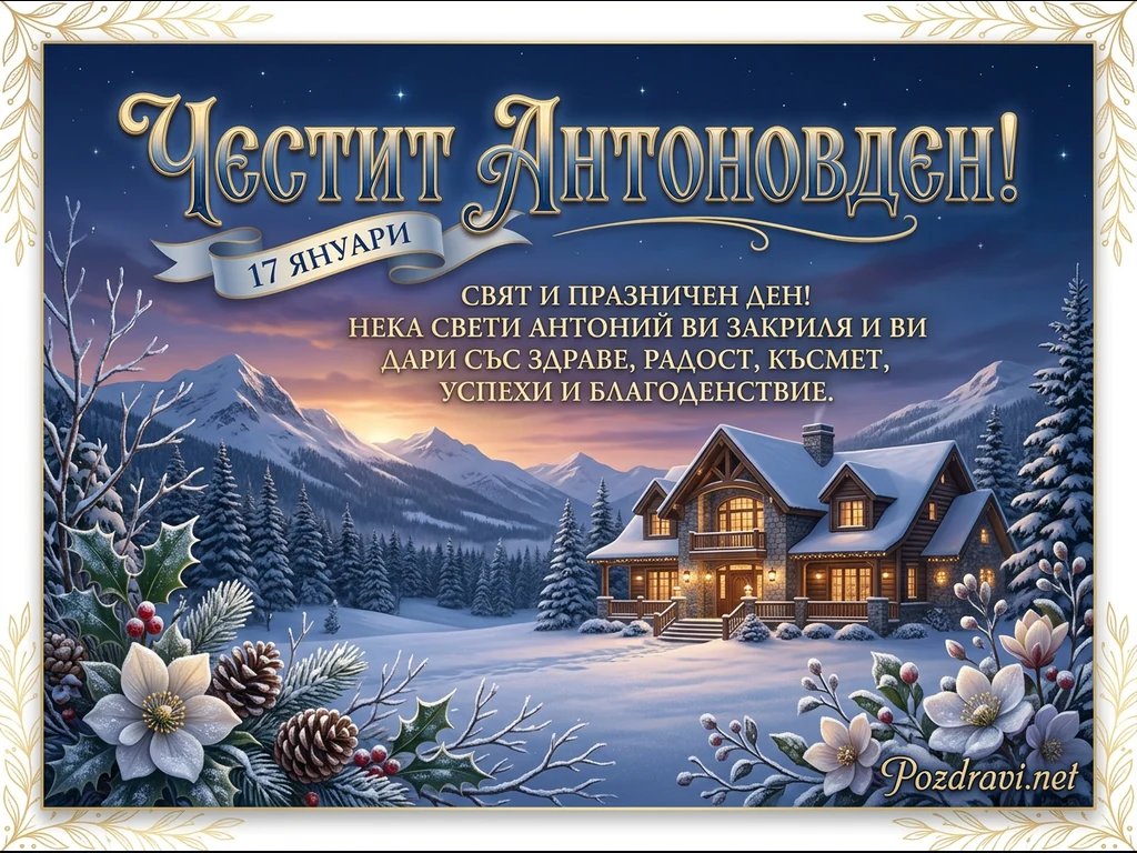Тази празнична картичка за Антоновден изобразява живописна зимна сцена. В центъра е разположена уютна къща с осветени прозорци, заобиколена от заснежени елхи и величествени планини на заден план. Небето е в преливащи нюанси от тъмносиньо до нежно оранжево, създавайки спокойна атмосфера на залез или изгрев. Долните ъгли са украсени с коледни елементи като имел, шишарки и нежни зимни цветя, а в горната част е изписано 'Честит Антоновден! 17 Януари' с пожелание.