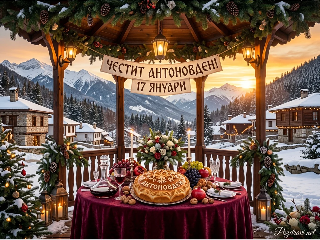Празнична зимна сцена разкрива уютна беседка, богато украсена с елхови клонки, шишарки и светлини. На централно място е опънат транспарант с надпис 'ЧЕСТИТ АНТОНОВДЕН! 17 ЯНУАРИ'. Под него е поставена маса с червена покривка, отрупана с традиционна пита с надпис 'АНТОНОВДЕН', плодове, ядки и вино, аранжирани около красив цветен букет. Заден план разкрива живописно планинско село, покрито със сняг, с традиционни къщи и заснежени борови гори, озарени от топъл залез. Цялостната атмосфера е празнична и гостоприемна, подчертана от светещи фенери и свещи.
