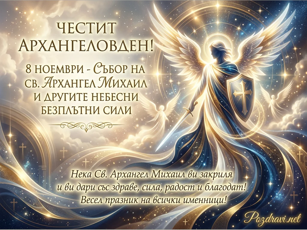 Тази дигитална картичка поздравява за Архангеловден, изобразявайки величествен архангел с разперени златни крила. Фигурата държи меч и щит с кръст, обгърната от сияйна светлина и искрящи частици на фона на небесни облаци и звезди. Около главния архангел се виждат по-малки, ефирни ангелски силуети, допринасящи за тържествената атмосфера. Текстът на картичката отбелязва 8 ноември като Събор на св. Архангел Михаил и отправя пожелания за здраве, сила, радост и благодат към именниците.