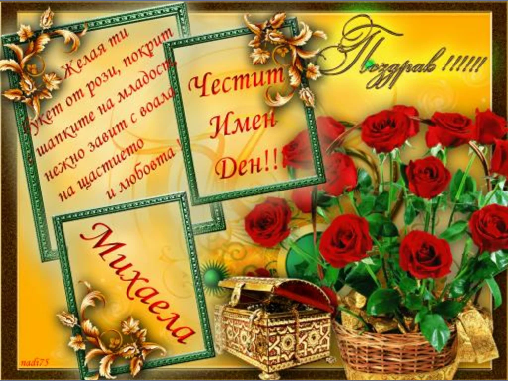 Ключови фрази: Архангеловден Михаела щастия любов злато бижу скъпоценности алени рози букет кошница картичка поздрав картичка пожелание