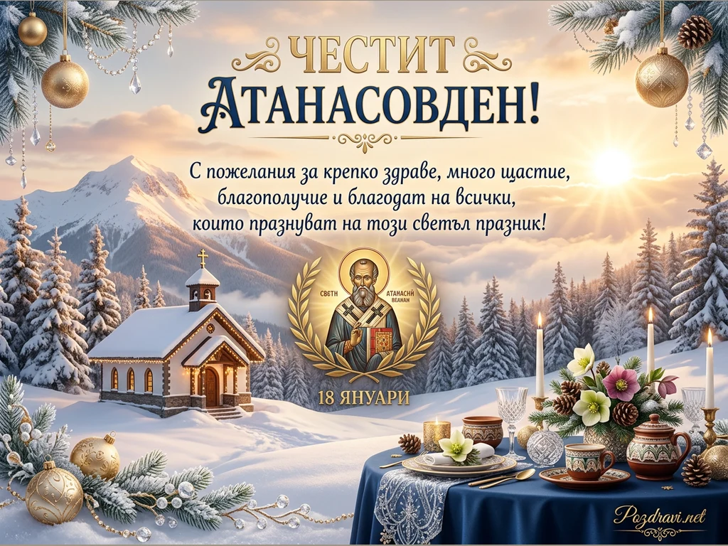 Тази празнична картичка за Атанасовден изобразява живописен заснежен планински пейзаж с малка църква, обградена от борови дървета под ярко слънце. В горната част са разположени коледни клонки със златни орнаменти, а в центъра е медальон с лика на Свети Атанасий и датата 18 януари. На преден план е аранжирана елегантна маса със свещи, цветя и чаши, създаваща уютна атмосфера. Поздравът 'ЧЕСТИТ АТАНАСОВДЕН!' е придружен от пожелания за здраве, щастие и благодат.