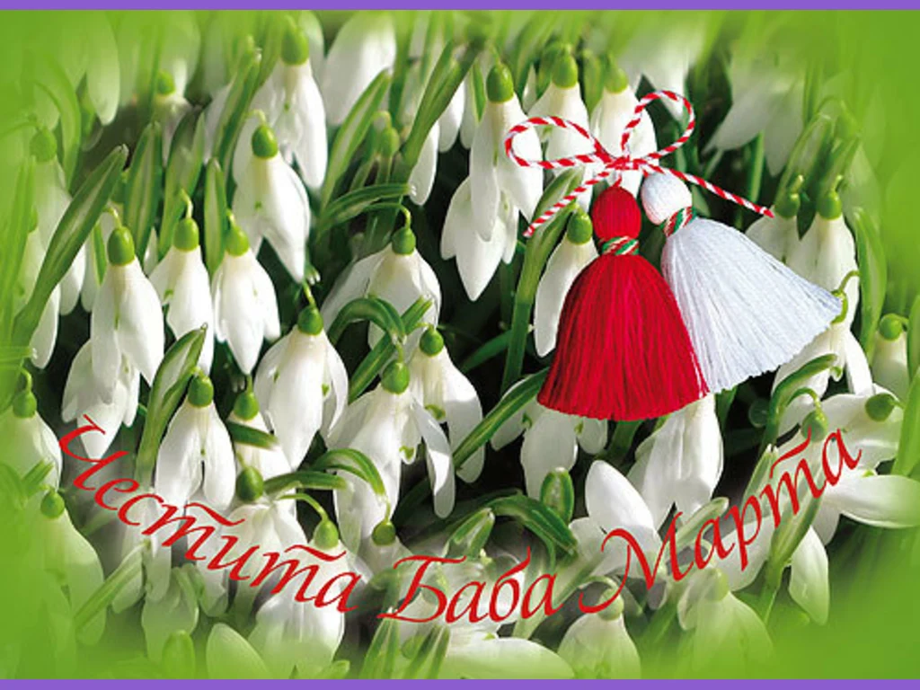 Ключови фрази: Картичка поздрави пожелание червено бяло мартенички любов пижо пенда букет кокиче пролет красота любов